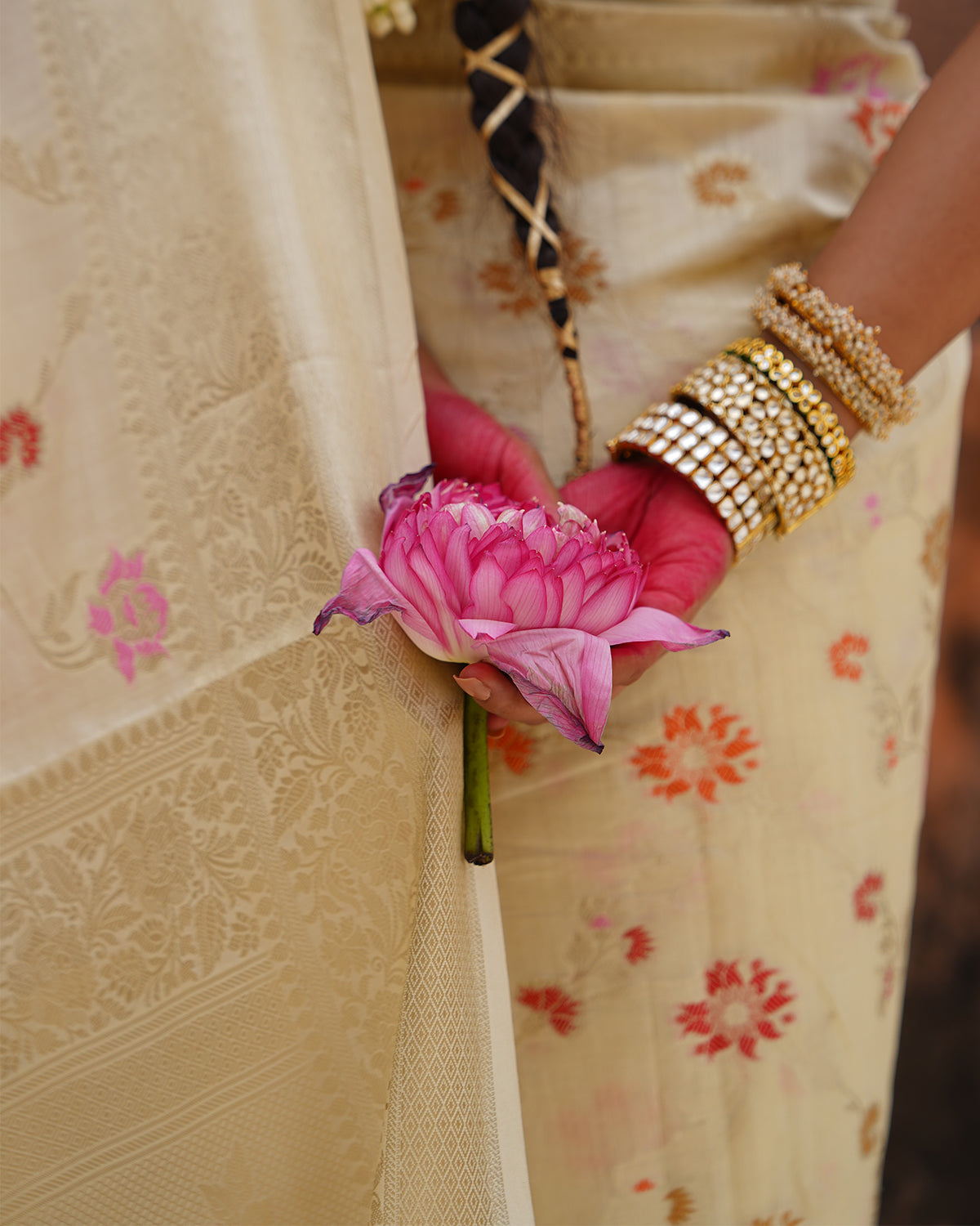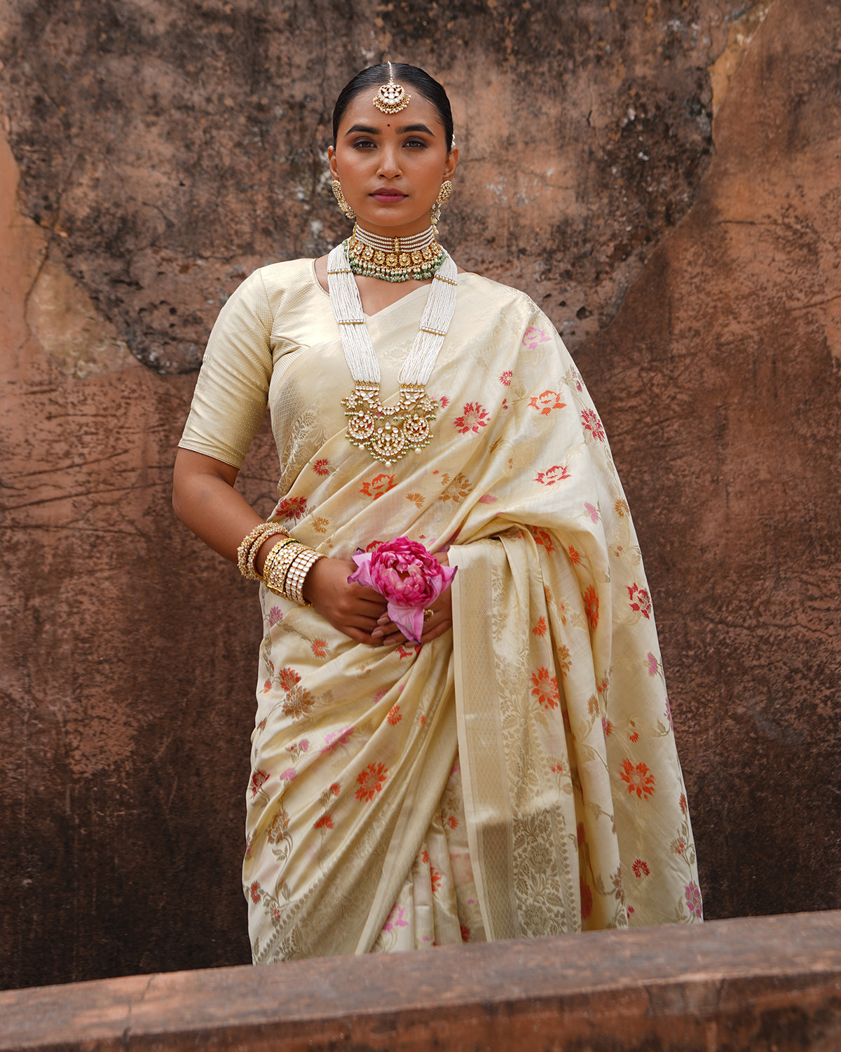 Champagne Blossom Pure Banarasi Saree with Delicate Floral Motifs Weaves