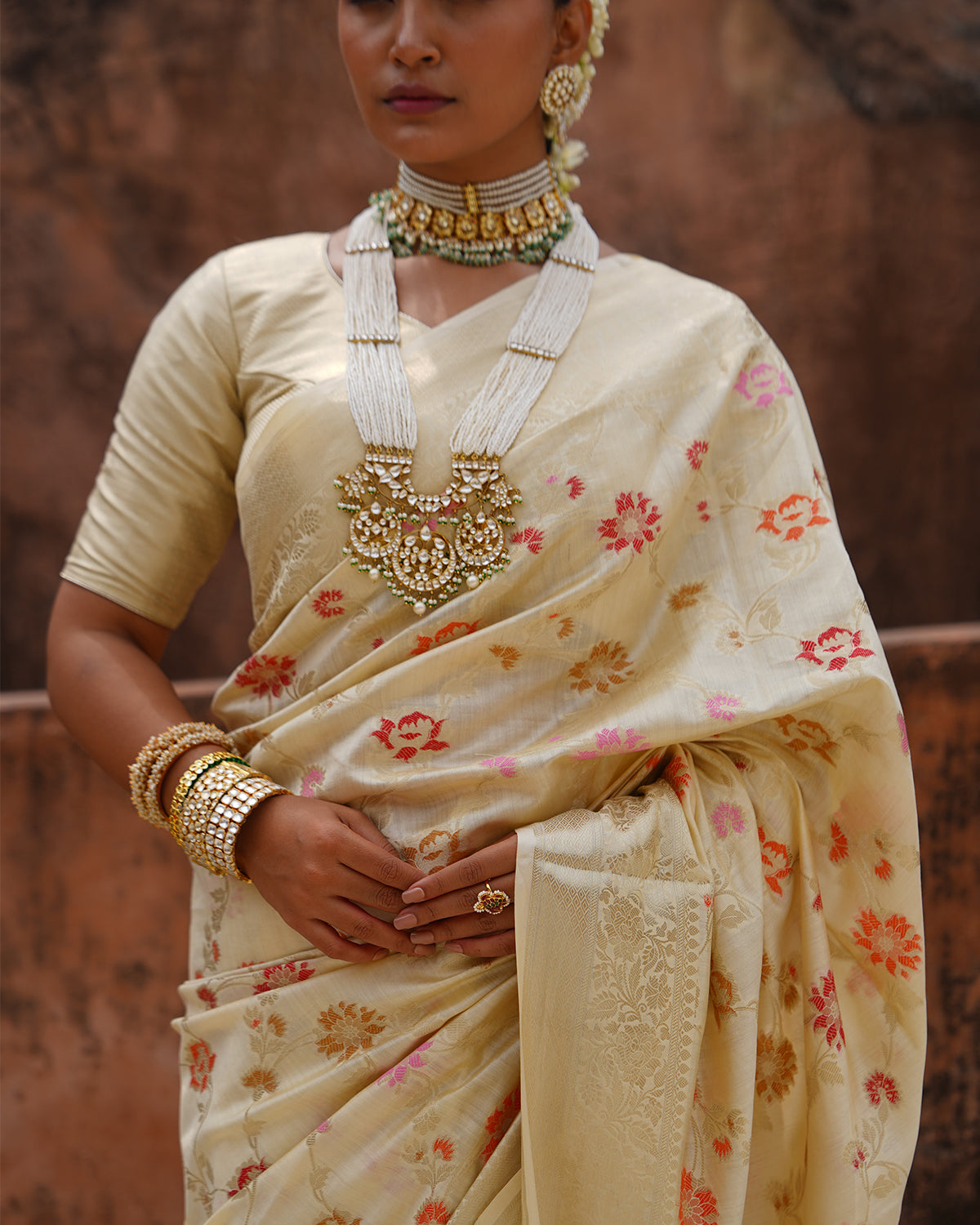 • Design: Handwoven with delicate floral motifs across a luminous champagne base, this saree embodies the timeless sophistication and exquisite craftsmanship of Banaras weaving tradition.