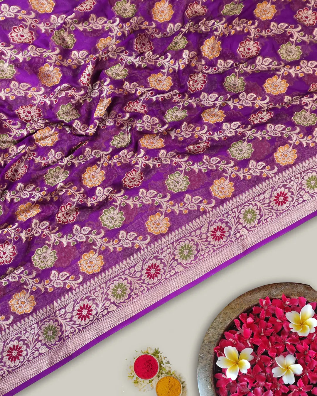 • Elegant and delicately vibrant, this Purple Floral Meenakari Pure Chiffon Saree captures a perfect balance of colour, craftsmanship, and fluid grace. The rich purple hue brings a regal softness to the drape, while the airy texture of pure chiffon ensures a light, effortless fall—ideal for festive evenings, intimate celebrations, and refined traditional gatherings.