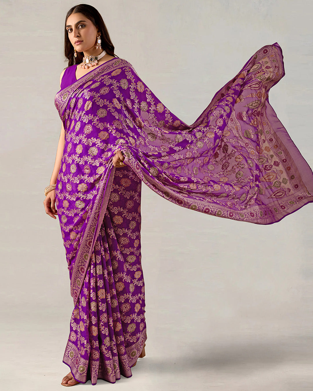 • Purple Floral Meenakari Pure Chiffon Saree reflects understated elegance and refined craftsmanship. Woven in a soft purple tone, the saree offers a balanced presence that feels both traditional and sophisticated. The lightweight pure chiffon fabric allows for a smooth, fluid drape, making it well-suited for festive occasions, formal gatherings, and intimate celebrations.