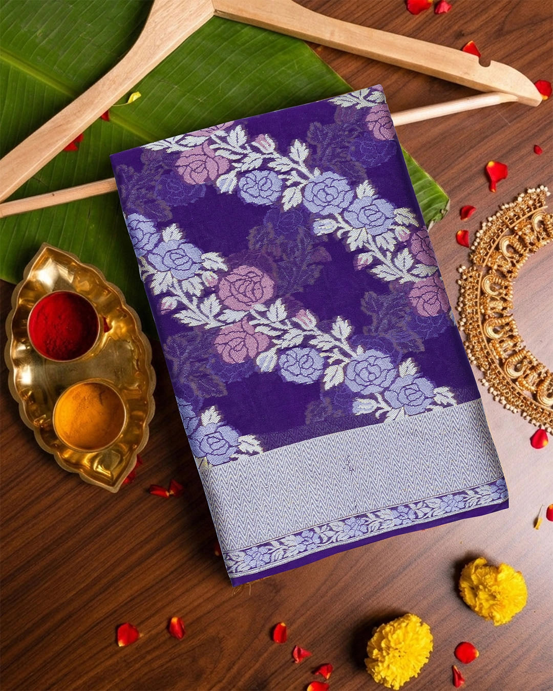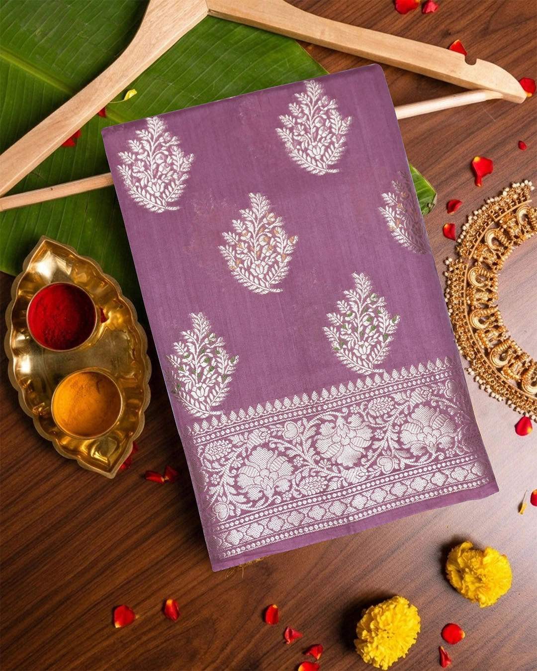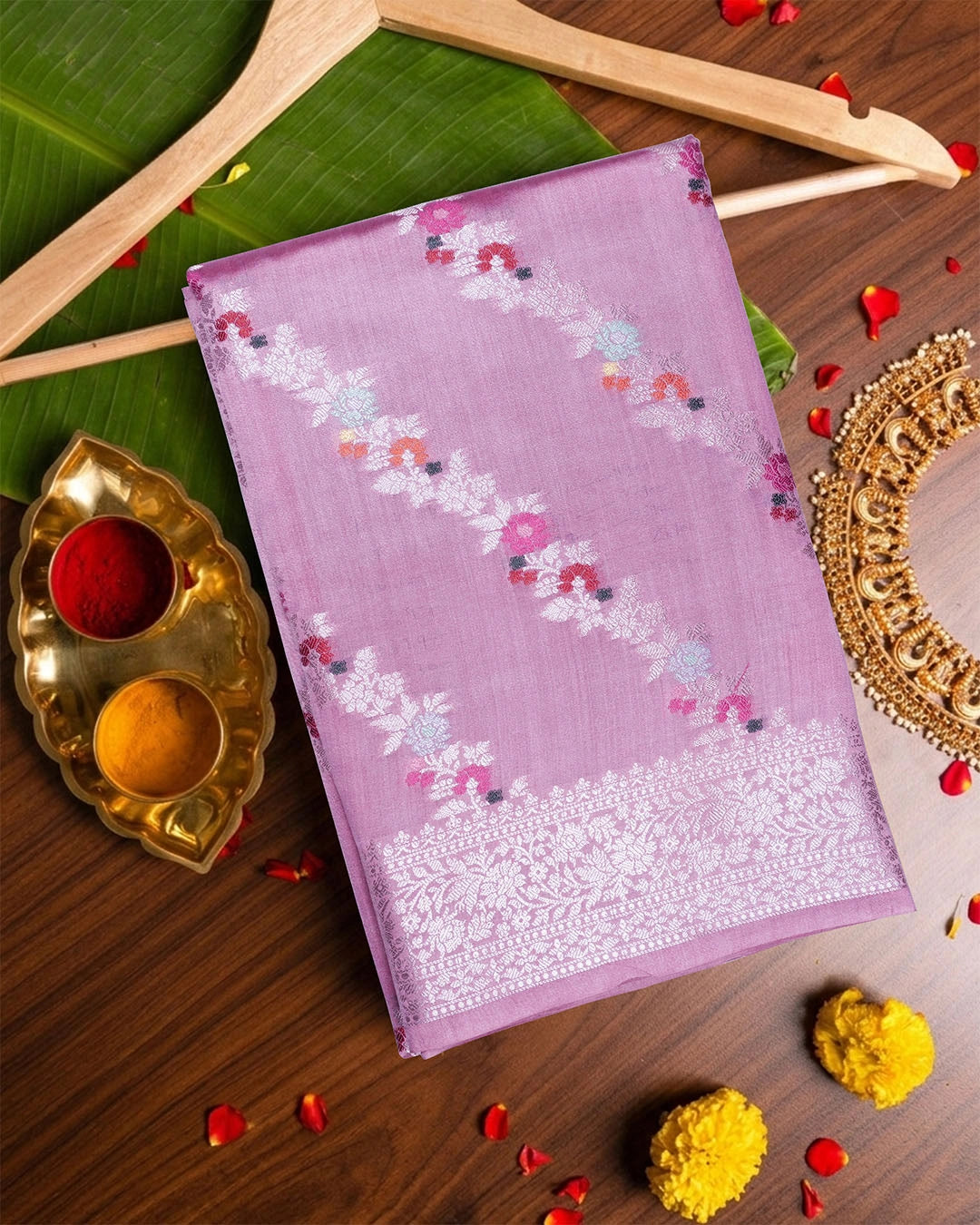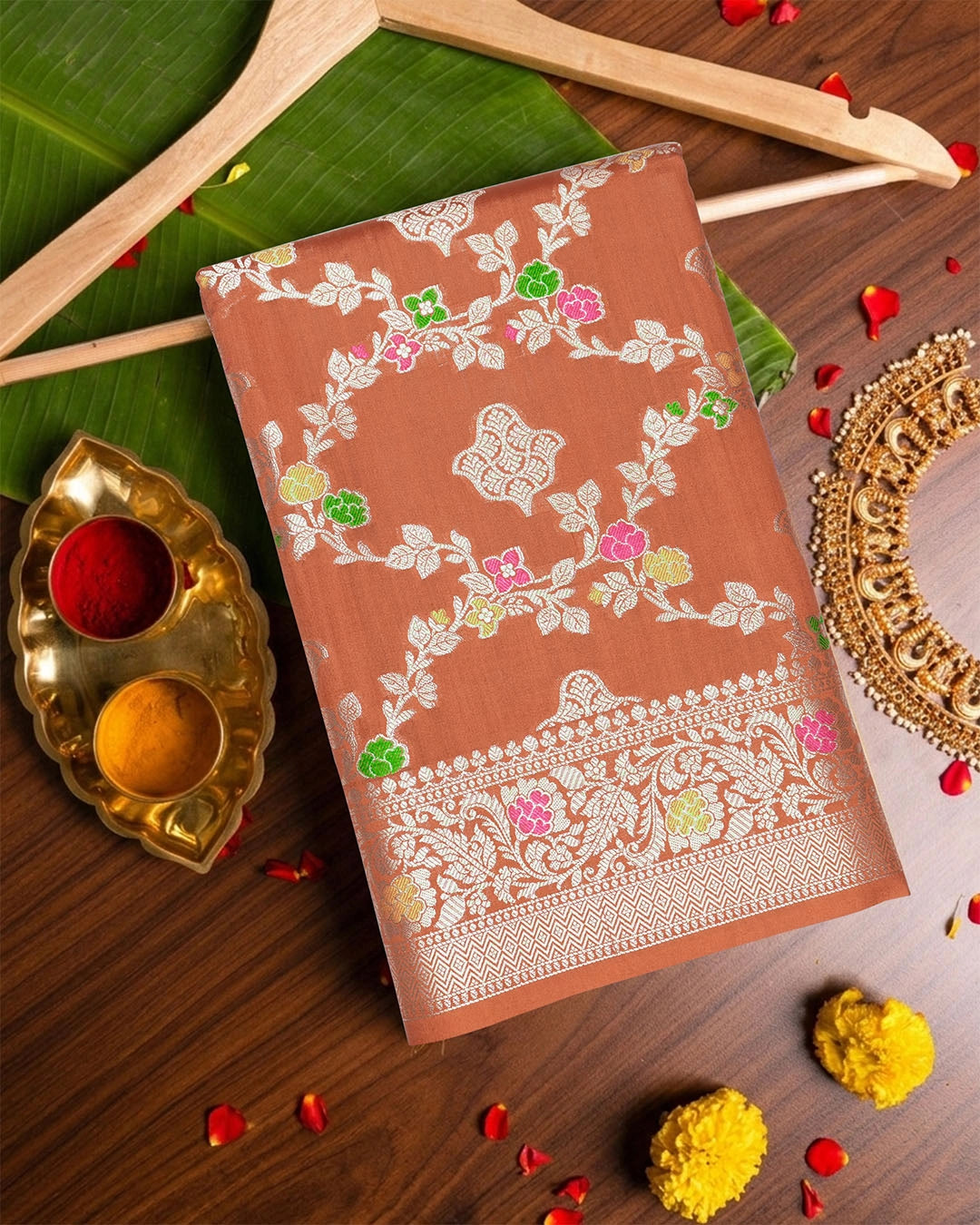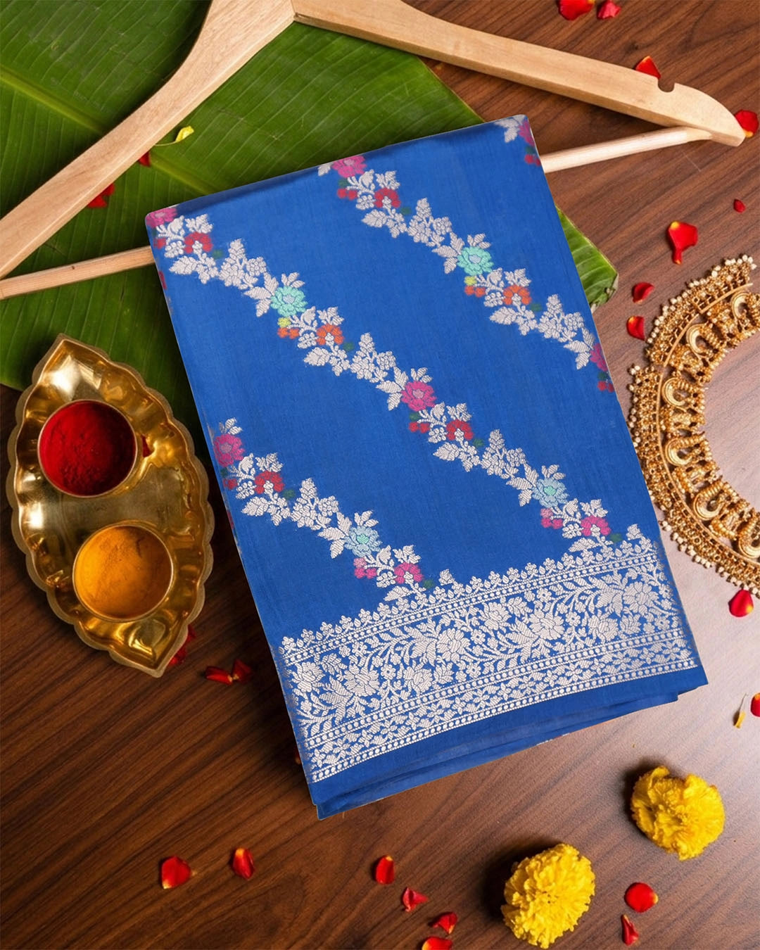 A collection of pure Banarasi sarees made of 100% pure silk threads showcases the rich heritage and timeless craftsmanship of Banaras. These sarees are celebrated for their luxurious feel, intricate designs, and cultural significance.