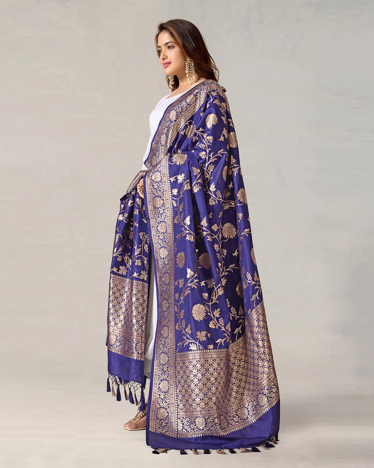 Royal Blue Pure Katan Silk Dupatta with Mughal Jaal Weaves