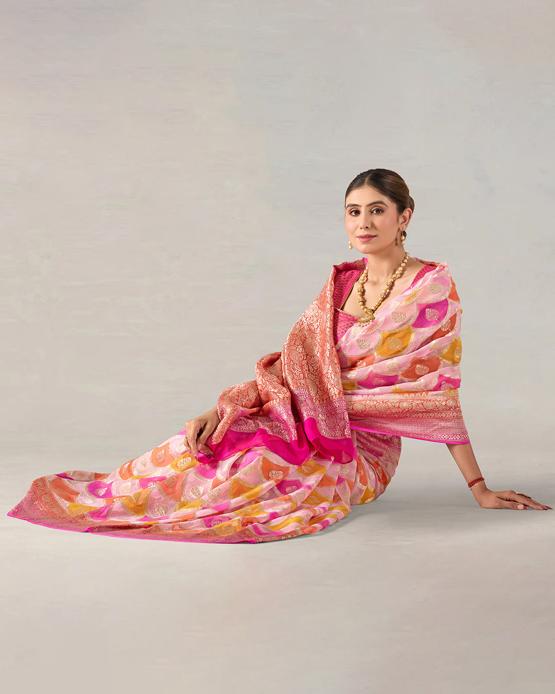 Pastel Pink Pure Khadi Georgette Saree with Multicolor Floral Jaal Weave