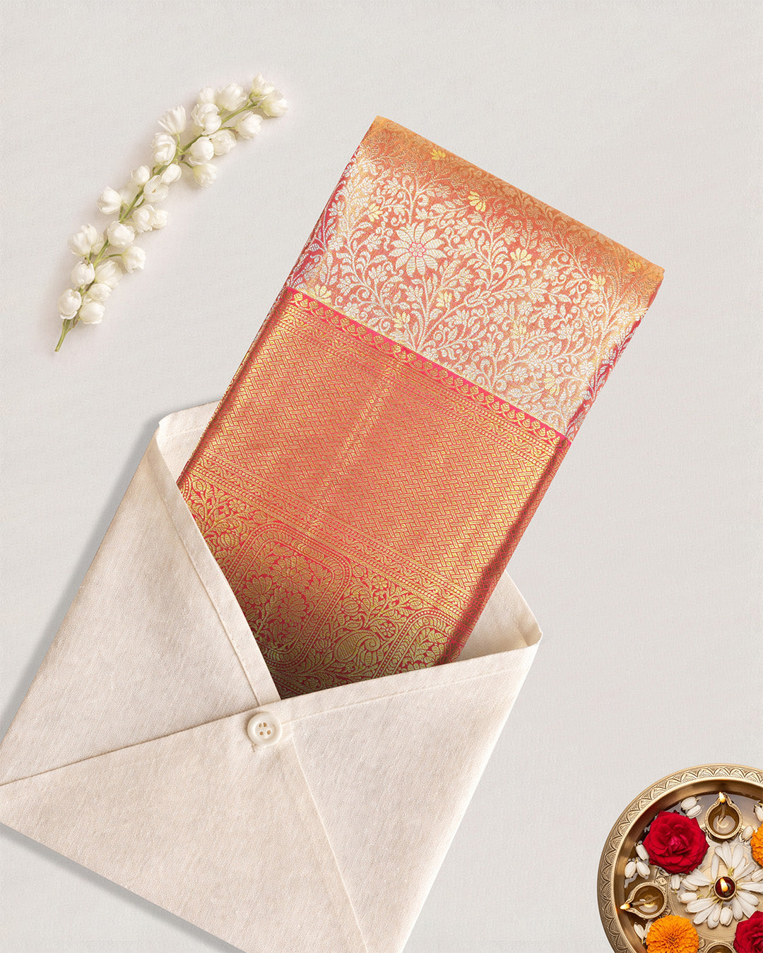 Coral Rose Pure Kanjivaram Saree with Dense Floral Jaal Weaves