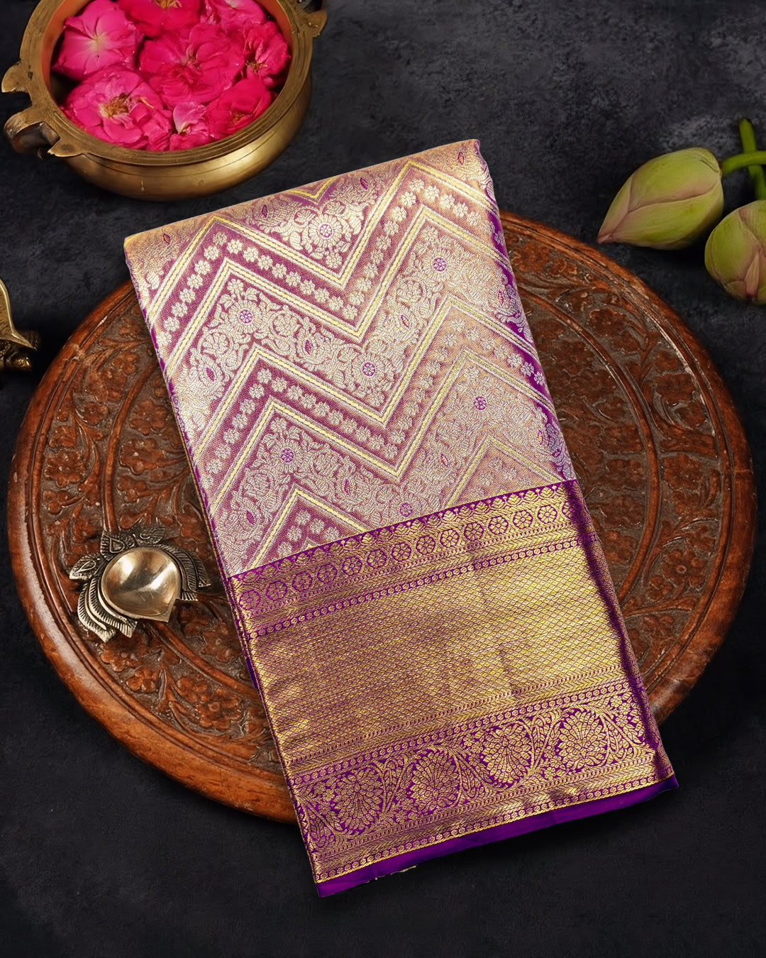 Royal Purple Pure Kanjivaram Saree with Chevron Weaves and Border