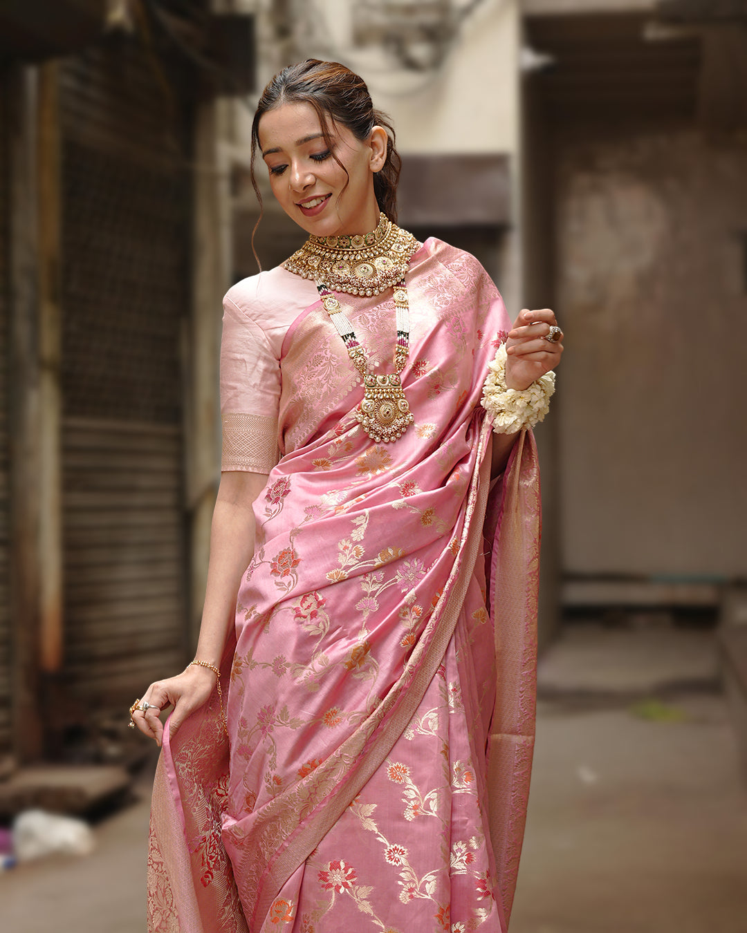Mauve Pink Pure Banarasi Saree with Floral Jaal and Vibrant Meenakari Weaves