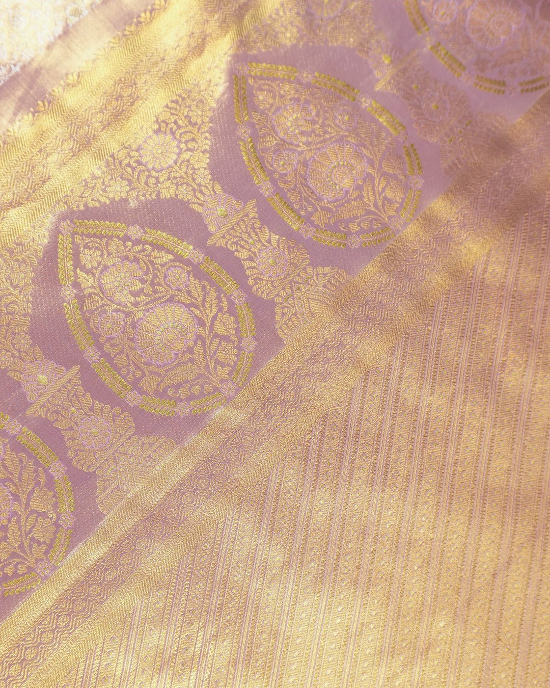• Color: Deep orchid mauve with gleaming gold zari highlights
