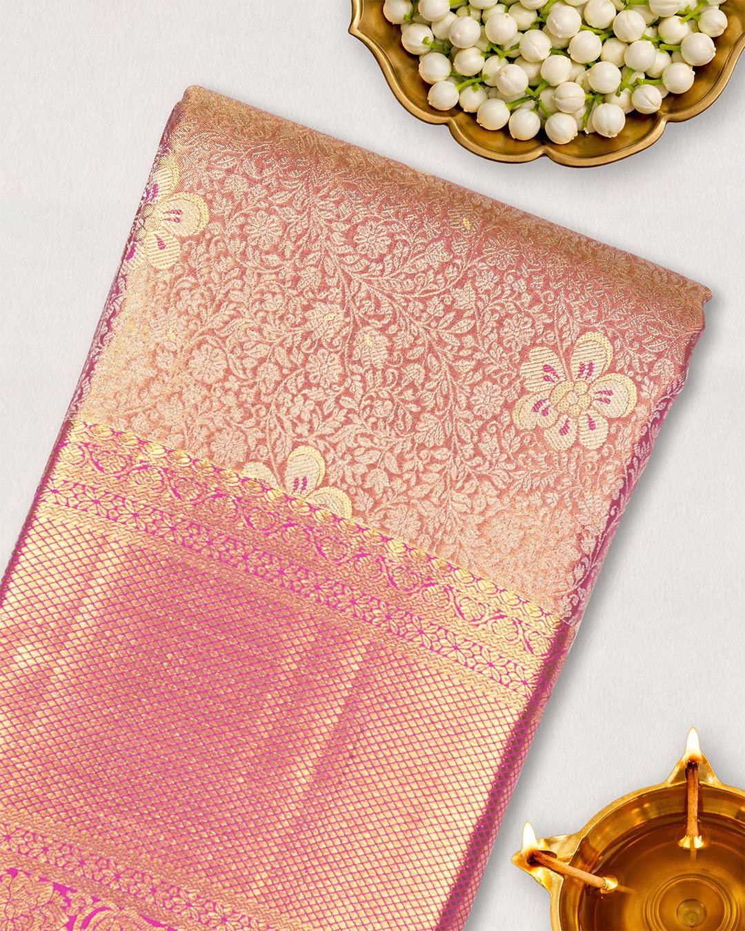 • Color: Rose pink base with rich gold zari accents