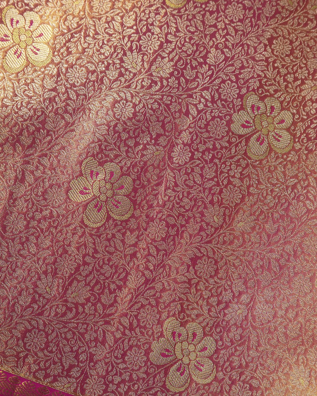 • Design: The body of the saree is meticulously adorned with floral jaal weaves, where intricate flower and vine motifs are interlaced into a continuous, tapestry-like pattern that adds incredible depth and texture. This elaborate body is perfectly complemented by a brocade border, featuring a rich and dense weaving of gold zari that provides a bold, traditional frame. The harmony between the detailed floral jaal and the heavy brocade border reflects a masterful balance of delicate artistry and majestic Kanjivaram heritage.