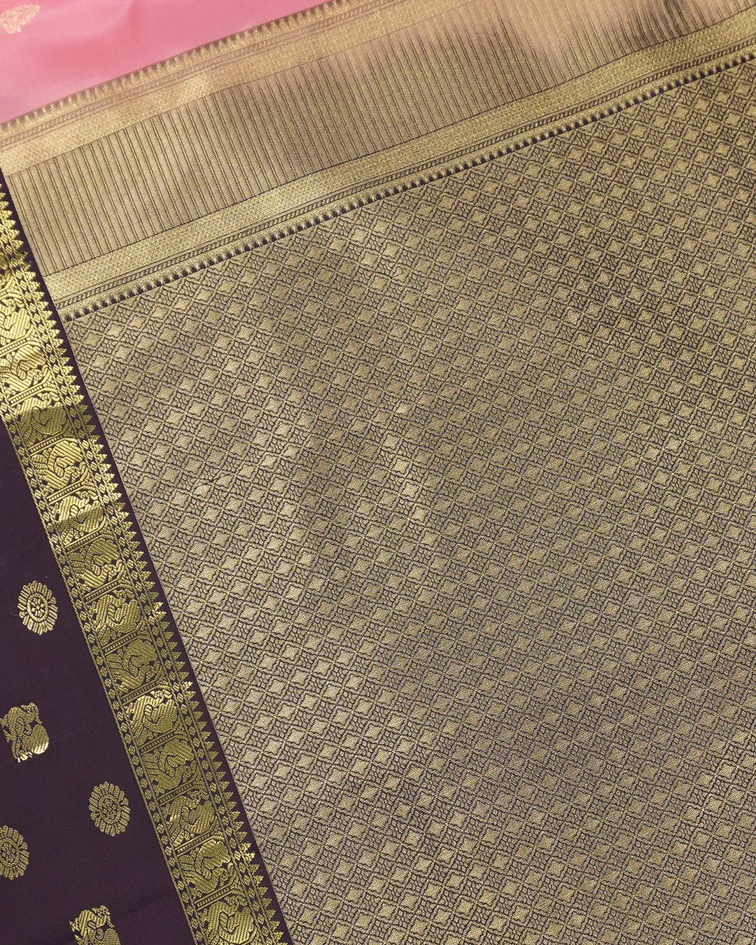 Pink Pure Kanjivaram Saree with Purple Contrast Pallu and Gold Butis - katansi