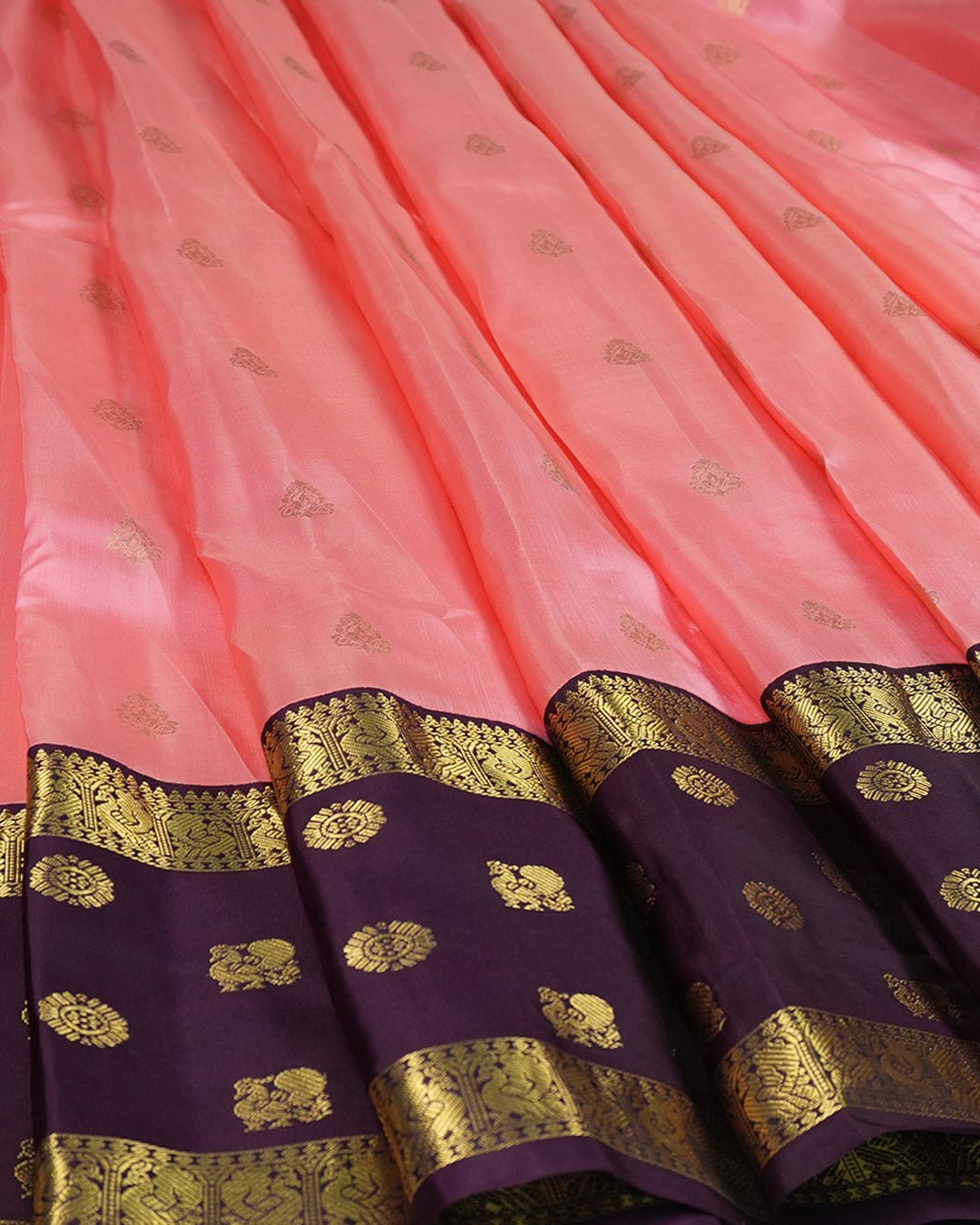 • Color: Soft pink with purple contrast pallu and gold zari accents