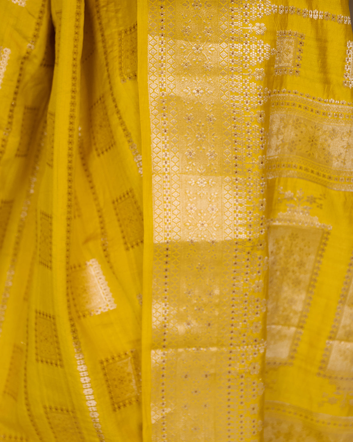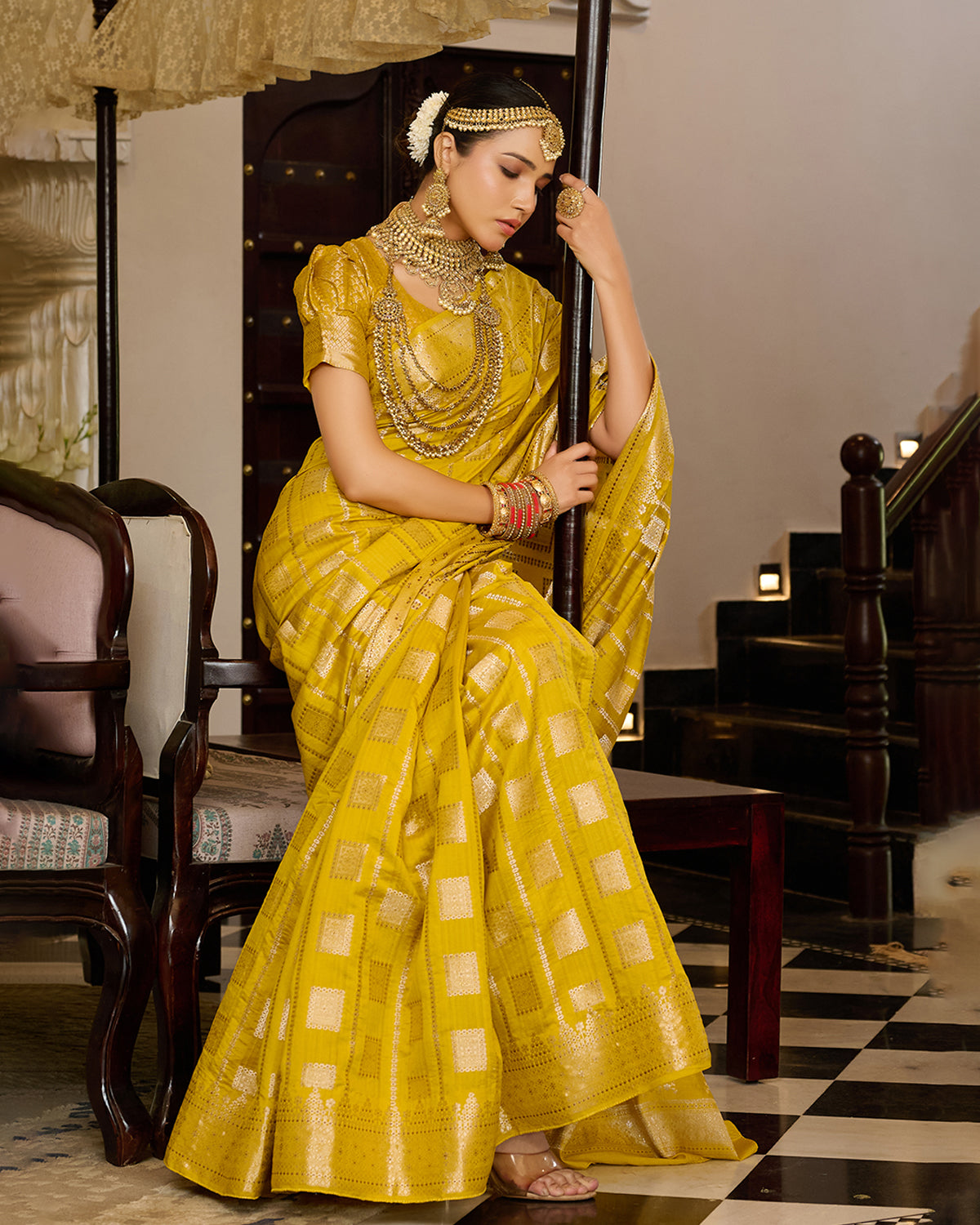 Mustard Pure Banarasi Saree with Checked Zari Embellishments