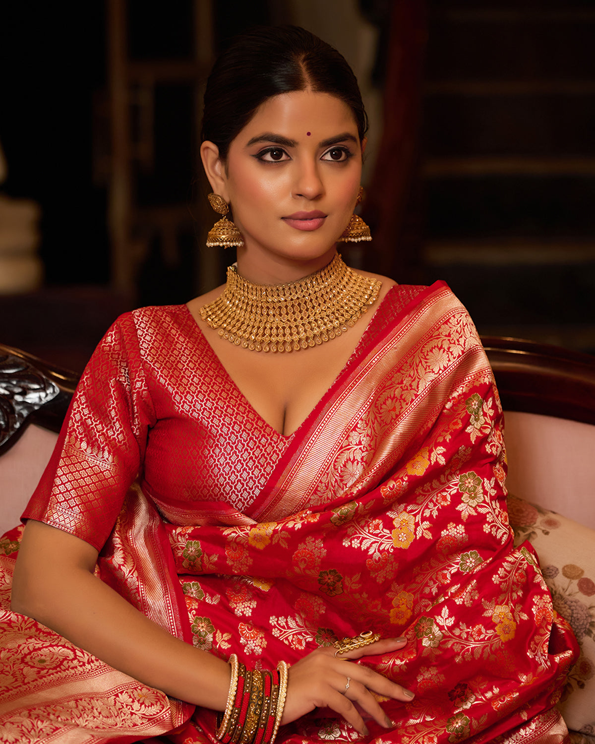• Design: Handwoven with regal floral meenakari zari weaves across a lustrous red base, this saree reflects the grandeur and intricate artistry of Banaras. Its radiant sheen and majestic detailing capture the essence of timeless elegance and royal heritage.