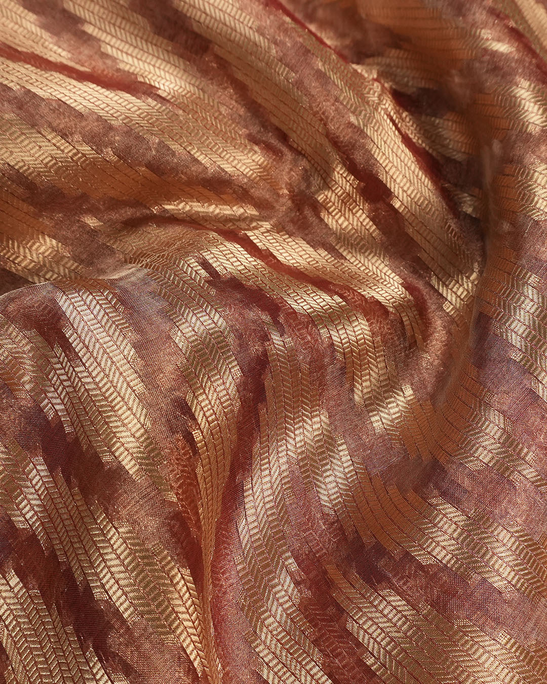 Soft Maroon Pure Tissue Silk with Woven Stripes and Heritage Gold Border